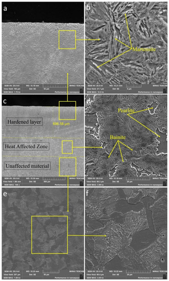 For the purpose of conducting a detailed study of the microstructure, a SEM analysis of the zones (Figure 5a–f) of the cross-section of 30CrMnSiA steel treated according to mode No. 2 with a large magnification was carried out. As shown in Figure 5e–f, the microstructure of the initial state of 30CrMnSiA steel consists of a ferrite-pearlite phase. A characteristic feature of the used EPTCH hardening technology is the zonality of the formed structures as the layer had a different microstructure in depth. They could be broadly divided into a hardening zone and a zone of thermal action from the surface in the direction of depth. The microstructure of the hardened layer consisted of a needle-like martensitic structure (Figure 5a–b), which is similar to a typical hardening microstructure [46]. Due to the high temperature reached during heating, the atoms in this region can be easily redistributed, which, upon subsequent cooling, forms a finely dispersed lamellar martensite. The depth of the hardened layer of sample No. 2 was measured and was approximately 700 microns, respectively. The heat-affected zone contains bainite, ferrite, and pearlite.