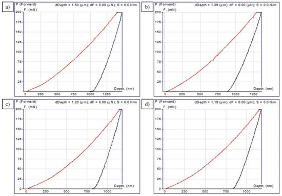 This technique implies selecting the parameters of a power function describing the experimental dependence of the depth of immersion of the indenter and the contact area on the applied force, as well as calculating the hardness and modulus of elasticity according to these data. The curves of the dependence of the normal force on the penetration depth are shown in Figure 6a–d, and the corresponding measured values, i.e., indentation hardness (H) and the reduced modulus of elasticity (Er), are given in Table 2.