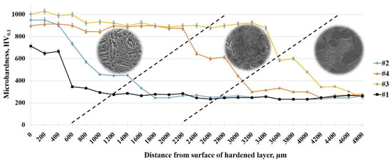 At the periodical switching of high voltage (320 V), medium voltage (200 V), and low voltage (50 V) the heating rate is periodically increased and decreased, which allows an increase in time and obtaining a thicker heated layer. The periodic variation of electric field strength between the surfaces of the liquid electrode and the product changes the power density of the surface heating, which controls the electrolyte-plasma heating and creates the necessary thermal conditions for the formation of hardening structures. By periodically changing the power density of heating, it is possible to obtain hardened layers with thickness of 0.6, 2.2, and 3.4 mm. The hardness of the hardened layer was measured using a hardness tester. The microhardness of the cross section has a maximum value at the edge of the surface in the hardened layer and then decreases into the depth of the sample (Figure 7). The highest value of the microhardness of the steel surface of 30CrMnSiA in the zone of the hardened layer with a thickness of about 3 mm is achieved after EPTCH according to mode No. 3 and is ~1000 HV with a martensitic structure, and a lower value is observed after EPTCH according to mode No. 1, where the thickness of the hardened layer is approximately 0.6 mm. Further into the depth of the material along the cross section, these indicators decrease, in the heat-affected zone with a martensitic-pearlite structure, the value of microhardness gradually decreases to the zone of the matrix with a ferrite–pearlite structure, where microhardness has the initial value. The increase in hardness is due to the presence of solid Fe3C and martensite, as confirmed by X-ray diffraction. According to the changes in microstructure and microhardness, it is clear that electrolytic plasma heating affects the structure and properties of the material, so the modified layer can be clearly distinguished from the main microstructure using simple optical microscopy to assess the effectiveness of the material hardening [47].