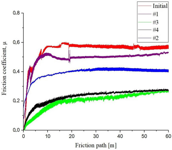 The number of EPTCH cycles has a significant impact on tribological characteristics. To determine the tribological parameters of the surface, tribological tests were performed on the sliding friction of surfaces according to the “ball-on-disk” scheme using an automated friction machine Tribometer TRB3 [48]. The graph of the distribution of the sliding friction coefficient of steel 30CrMnSiA under different thermal cycling modes is shown in Figure 8. It was determined that the value of the sliding friction coefficient µ of the initial state of the 30CrMnSiA steel sample is ~0.55, and after the EPTCH, the value of the average sliding friction coefficient decreases by 2.4 times compared to the initial state. An increase in wear resistance and a decrease in the coefficient of friction is a result of the presence of solid Fe3C and martensite. It was determined that the sample with the lowest coefficient of friction (No. 3) has the largest amount of cementite in the phase composition.