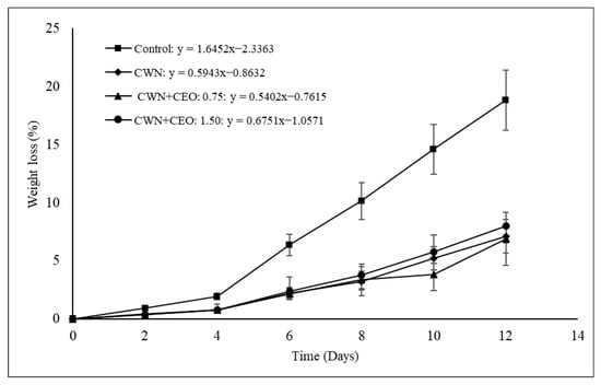 Weight loss is an important postharvest quality criterion for papaya. Changes to skin permeability and consequently increased water loss are effects of senescence, that can be minimized by coating application [20]. All fruits showed increased weight loss (Figure 1) with increasing storage time, while the lowest weight loss (6.9–7.9%) was obtained for coated papayas. According to Gerreiro et al. [31], edible coatings act as a barrier against moisture loss, leading to a reduction in fruit weight loss. Coatings formulated with CWN and CEO acted as barriers to water diffusion, decreasing fruit transpiration [32]. A similar result was observed for tomatoes [17] and papayas [18] coated with CWN. The coated fruits showed less weight loss compared to the control fruits.