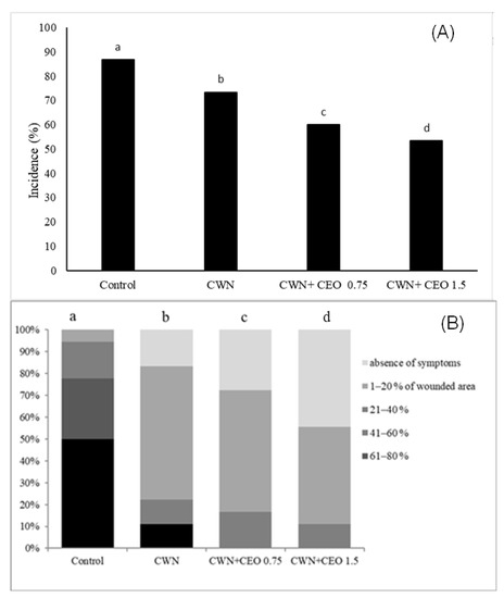 Fruit incidence (A) and severity (B) evaluation at the end of the storage period of 12 days at 16 °C for (a) uncoated, (b) CWN, (c) CWN + CEO 0.75%, and (d) CWN + CEO 1.50%. Control: uncoated fruit; CWN: carnauba wax nanoemulsion at 9% of solid phase in suspension; CEO: C. martinii essential oil at 0.75% or 1.50%. Distinct letters represent a significant difference between treatments by the Kruskal–Wallis test (p < 0.05).