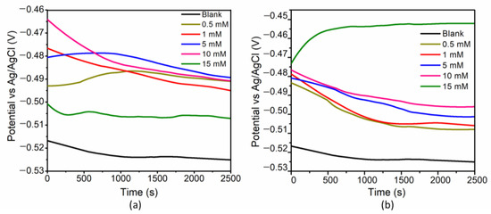 The variations in the OCP for the system containing EN3B mild steel and Ag/AgCl electrodes immersed in blank solution (with different amounts of Py8 and Py12, in comparison with the blank corrosive media without inhibitors) are represented in Figure 2. The property of self-organization of surfactant monomers with the increase in concentration can affect the structure (and hence the stability) of any adsorbed film. Hence, the concentration of both surfactants was varied from 0.5 to 15 mM to observe the changes in OCP as a function of concentration. In most cases, a time period of 2500 s was reasonably sufficient for the stabilization of OCP, as can be seen in Figure 2. The OCP of the blank solution was stabilized near −0.52 V vs. Ag/AgCl. On addition of Py8 and Py12, the potential was shifted towards anodic direction (less negative) relative to the blank, indicating an inhibitory effect [39].