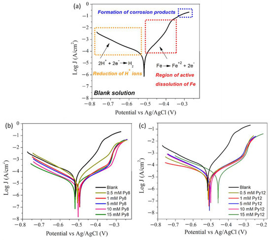 For any corrosion inhibitor to be precisely categorized as cathodic or anodic type, a typical overpotential of ±85 mV is usually required. For OCP displacements smaller than ±85 mV (as compared to the OCP of blank solution), the inhibitors cannot be specified as anodic or cathodic and a mixed type of behavior of inhibitors can be predicted [40,41,42]. In the case of Py8 and Py12, when added to the blank solution the OCP is shifted towards the positive potential for all concentrations, and nobler values are obtained as compared to the blank solution. Interestingly, the OCP displacement at 15 mM concentration is minimum for Py8 and maximum for Py12. All these shifts and variations in the OCP may arise due to the changes on and near the surface of the EN3B mild steel electrode, including the electrochemical reactions taking place in the corrosive media, and the variation of the structure of adsorbed film by self-assembling of surfactants as a function of concentration [43].
