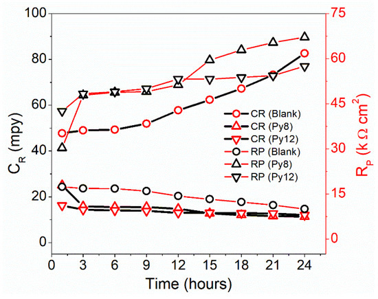 The impact of prolonged exposure of EN3B mild steel to corrosive media, 3.5% NaCl (pH 1.5), was investigated through the LPR method for up to 24 h. The activity of Py8 and Py12 was examined at a fixed concentration (5 mM) as a function of immersion time [46]. The results are graphically demonstrated in Figure 4, and the values of IE, polarization resistance RP and corrosion rate (CR) are tabulated below (Table 3).
