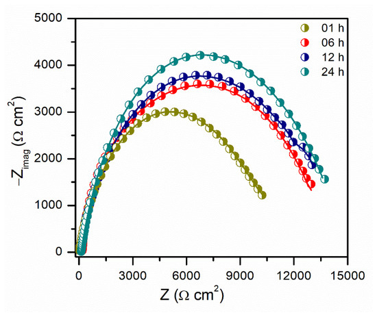 The changes in the EIS spectra of Py8 were examined for up to 24 h at a fixed concentration (10 mM), and the results are demonstrated in Figure 7. The corresponding EIS parameters are also listed in Table 5. Similar to the LPR measurements, the IE of Py8 was found to increase with the passage of time. The diameter of the capacitive loop increased with the increase in exposure time, and no inductive effect was observed. An increase observed in the values of Rct and Rp was associated with the formation of a more ordered adsorbed layer of Py8 molecules at the surface of EN3B mild steel, as a function of exposure time.