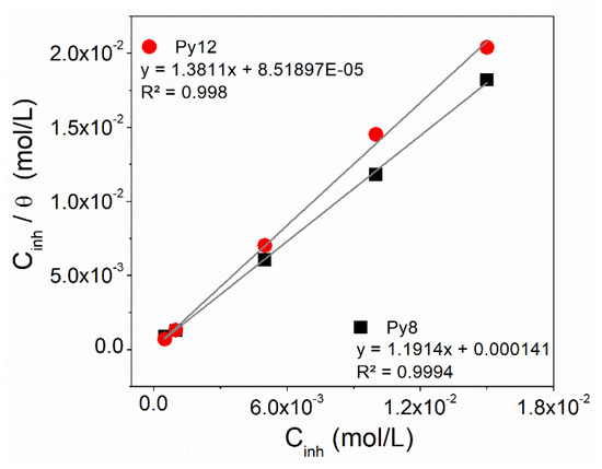 The experimental data were fitted to different models of adsorption isotherm but the best approximation is obtained through the Langmuir model [14,44]. The adsorption isotherm of Py8 and Py12 on the EN3B mild steel surface in 3.5% NaCl solution at pH 1.5 follows a straight line (Figure 8), which means the Langmuir adsorption pattern is obeyed according to this model: