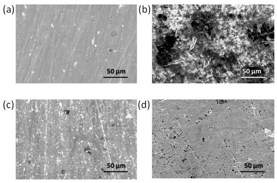The morphology of EN3B mild steel specimens was studied through SEM analysis before and after corrosion (Figure 9), with and without inhibitors. The polished steel samples displayed a uniform and smooth surface (Figure 9a); however, the presence of 3.5% NaCl at pH 1.5 adversely affects the surface of EN3B mild steel, and hence it is badly corroded (Figure 9b) within a period of 6 h. In the presence of 10 mM inhibitors (Py8 and Py12), the EN3B mild steel surface is much less corroded as compared to the blank solution, as shown in Figure 9c,d. The inhibitor molecules are supposed to form an adsorbed layer on the surface of steel, which hinders the attack of corroding species in the solution [72,73,74]. The adsorbed layer of Py8 and Py12 acts as a barrier between the corrosive environment and the EN3B mild steel surface, keeping the rate of corrosion very low, which is also supported by electrochemical measurements.