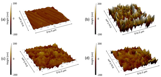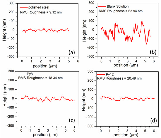 The morphological variations on the EN3B mild steel surface have also been studied through AFM, with and without the effect of inhibitors. The AFM images of polished EN3B mild steel and the steel coupons immersed in uninhibited and inhibited solutions are presented in Figure 10. If we compare Figure 10a,b, the polished steel displays some scratches but still has a uniform and smooth surface as compared to the steel attacked by aggressive chloride media. However, in the presence of inhibitors, the EN3B mild steel surface is much more protected from the attack of Cl− ions, and the surface roughness is considerably reduced (Figure 10c,d), with the number of crest peaks and shallow valleys being significantly lowered. The surface roughness of the steel coupons can also be estimated from the height profiles obtained through AFM analysis (Figure 11). The root mean square (RMS) roughness of polished steel coupons is 9.12 nm, but under the effect of 3.5% NaCl solution (pH 1.5) the surface is badly affected within 6 h, and RMS roughness comes out to be 63.94 nm. In the presence of Py8 and Py12, RMS is decreased to 18.34 nm and 20.49 nm, respectively, which highlights the efficiency of both inhibitors.