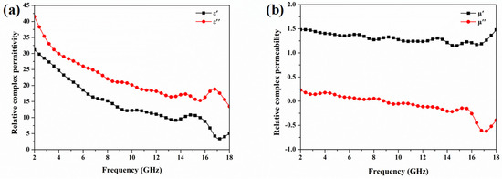 Ni-doped ZIF-67/ER was selected as the bottom panel layer. Figure 5 exhibits the electromagnetic parameters of Ni-doped ZIF-67/ER. The imaginary part of permittivity was much larger than the real part of permittivity, indicating the Ni-doped ZIF-67/ER layer exhibits excellent electromagnetic loss. Both the real and imaginary parts of permittivity exhibited an excellent frequency dispersion effect, implying the potential of broadband microwave absorption. The introduction of Ni made the bottom panel layer magnetic, which helped to improve the overall impedance matching performance according to Equations (2) and (3). It is noted that μ″ showed negative values for Ni-doped ZIF-67/ER within 10–18 GHz. According to the Maxwell equations, the alternating electric field and magnetic field can be transformed into each other. In this case, the dipole or interface resonance generates an oscillating electric field, and this electric field consequently induces an additional alternating magnetic field superposing on the oscillating magnetic moments under a high-frequency wave. The negative permeability will occur when the induced magnetic field is stronger than the latter.