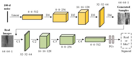 The GAN architecture is shown in Figure 1. For the generator, we feed into a 100 d random noise vector and reshape it to 4 × 4 × 8 using a linear function (because the mini-batch size is 64, the actual input size is 4 × 4 × 512 for each past). To enlarge the tensors, four deconvolutional layers are used with a kernel size of 5 × 5 and a stride of 2, denoted as {D1, D2, D3, D4}. Each deconvolutional layer follows a BN layer and a ReLU function, except the D4, which uses the tanh function. Finally, a sample that is 64 × 64 × 1 in size can then be generated. The discriminator receives the generated samples and real images as input. Similar to the generator, we use four convolutional layers to classify whether the input image is real or fake. These layers are also 5 × 5 in size with a stride of 2, denoted as {C1, C2, C3, C4}, each of which is equipped with a BN layer and a LeakyReLU function. The settings of output activation functions are followed by the outstanding conclusions in [27]. We add two fully connected layers to receive the last convolution feature maps and then feed them into a sigmoid output.