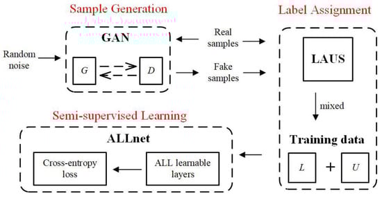 When there are enough unlabeled samples, the second problem is how to include them in training. Different from transfer learning that trains labeled and unlabeled samples alternately, the SSL system needs to train both simultaneously. The unlabeled samples are often assigned to weak or pseudo labels for SSL, which is not a good choice for GAN samples. The unlabeled samples they used, such as in studies [23,26], are real but GAN samples are fake data generated by training. The existing methods of processing GAN samples are too rough, treating them the same way during training—the GAN samples are regarded as an extra class [27] or placed directly into existing classes [28].