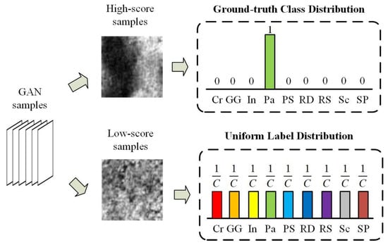 Instead of creating a new class or pseudo labels, the proposed LAUS aims to isolate the whole GAN sample and assign them to different label distributions. Through the model that was trained on original samples, each GAN sample can obtain the corresponding class probability vector, the maximum of which will be treated as its class score. The high-score samples are assigned to their corresponding ground-truth class distributions. These samples join the existing classes, act as real data, and extend the labeled samples. The low-score samples are assigned to a uniform label distribution over all the existing classes. These samples, therefore, belong to neither the existing classes nor a new class (see Figure 3). After the LAUS process, the GAN samples that share common knowledge with the real samples can be included in training and not affect the learning direction towards unknown or fake classes. With this strategy, we can train powerful models on enough defect data and avoid the risk of over-fitting.