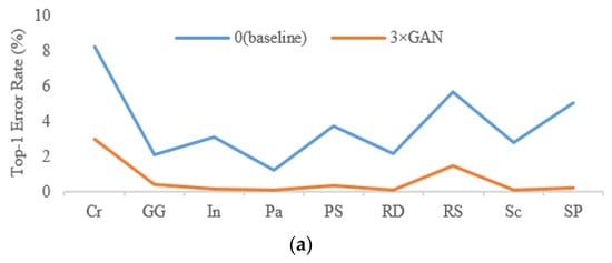 The effects of adding GAN samples on each defect class of NEU-CLS-64. (a) The Top-1 error rate comparison between no GAN samples added (baseline) and adding 3 × GAN samples. (b) The percentage of high-score samples and low-score samples of each defect class in the 3 × GAN samples.