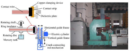 Taking the sliding between the C-Cu electrical sliding contacts in the railway pantograph-contact line system as an example, the research was carried out on the tester, as shown in Figure 1 [16,17]. The experimental device is composed of a moving part, an electric power supply part, and a load-applying part. The moving parts include a turning disc inlay with copper wires, a carbon slider clamp, a stepless motor, etc. The motor drives the turning disc to rotate so that the relative speed of the copper wire and the carbon slider can be adjusted continuously in the range of 30–400 km. The crank-link mechanism helps the C-Cu contacts simulate Z-word motion at a frequency of 3–20 Hz. The electric power supply part can provide 0–800 A adjustable AC/DC current for the contact pair, while the load-applying part can provide 0–300 N adjustable loads for the contact pair.