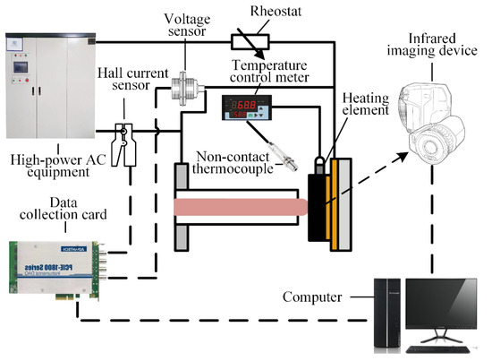 Figure 2 shows the data acquisition and temperature control system [16,17]. Hall voltage and current sensors are used to collect contact voltage drop and the loop current of the C-Cu contacts with ranges of 0–500 V and 0–800 A, respectively, and the frequency response is 0–100 kHz. The voltage and current data are transmitted and stored by the data acquisition card, and the sampling frequency is set to 5 kHz.