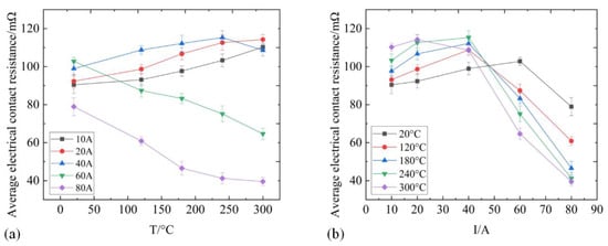 Figure 3 shows the variation in average ECR (AECR) with interface temperature. The influence of interface temperature on AECR is not consistent under different current conditions. Two opposite phenomena occur. In the first case, when the current is between 10 A and 20 A, the AECR increases with the rise in interface temperature. The rising rate of AECR increases continuously at 10 A but decreases after 240 °C at 20 A. In the second case, when the current is between 60 A and 80 A, the AECR decreases with increasing temperature. At 40 A, the change in ECR with interface temperature is more like the transition of the above two phenomena. An interesting U-shaped AECR curve with temperature rise is observed. At different temperatures, AECR has a relatively uniform trend with current, which has a slow rise and then decreases rapidly with increasing current. The AECR has a local maximum value in the range of the test current, and the local maximum value moves forward with the rise in temperature.