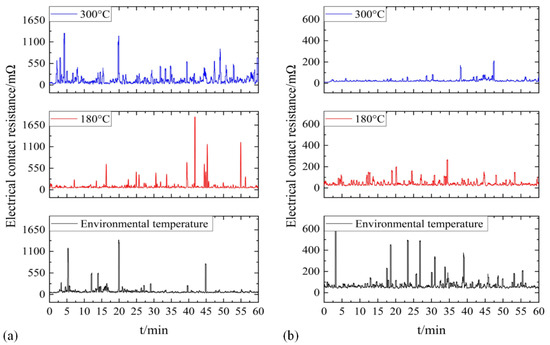 The influence of interface temperature on dynamic ECR (DECR) at currents of 10 A and 80 A was further studied, as shown in Figure 4. At 10 A, the DECR fluctuates around 75 mΩ under different interface temperatures, and the fluctuation becomes more serious with the increase in temperature. Therefore, at a current of 10 A, the increase in AECR with interface temperature is mainly caused by increased volatility in DECR. At 80 A, the high temperature significantly suppresses the fluctuation of DECR, and the DECR shifts downward as a whole. The two changes led to a rapid decline in the AECR. When the interface temperature is consistent, the difference between 10 A and 80 A results in a different joule heat injected into the contact spots. A joule heat of 80 A makes the contact spots even hotter. At 10 A, the softening effect of temperature is not obvious, and oxidation is dominant. The formation rate and thickness of the oxide film increase at the contact spots, resulting in enhanced fluctuation in the DECR. At 80 A, the softening effect of the temperature on the material may become the dominant factor, which is consistent with most research results on the influence of temperature on ECR [19,20,21].