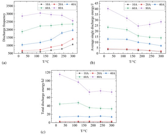 Effect of temperature on the arc discharge of the C-Cu contacts: (a) discharge frequency; (b) average single discharge energy; and (c) total discharge energy.