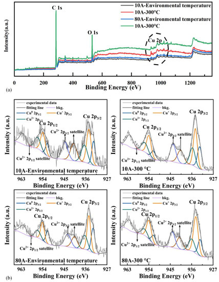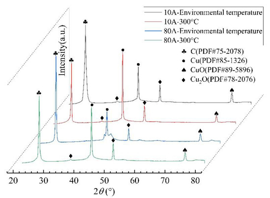 A quantitative analysis of elements was conducted (and is shown in Figure 7a) to obtain the atomic percentage of the elements on the carbon surface after the test, as shown in Table 3. The contents of copper and oxygen on the carbon surface increase with the interface temperature under different current conditions. When the current is 10 A, the proportion of copper and oxygen at 300 °C increases by 65% and 38.3%, respectively, compared with the same case at room temperature. When the current was 80 A, the content of copper and oxygen at 300 °C increased by 29.6% and 14.6%, respectively, compared with the same case at room temperature. However, the variations in the copper and oxygen content with current are opposite at different interface temperatures. When the interface temperature is room temperature, the proportion of copper and oxygen at 80 A is 21.7% and 8.3% higher than that at 10 A, respectively. However, when the interface temperature is 300 °C, the content of copper and oxygen at 80 A decreases by 4.6% and 10.2% compared with the case at 10 A.