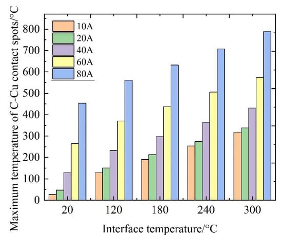 Figure 9 shows the maximum temperatures of the contact spots at different interface temperatures. It can be seen from Figure 9 that the temperature rise in the C-Cu contact spots is the result of the joint action of interface temperature and joule heat. When the interface temperature is controlled at room temperature, the temperature rise in the contact spots is mainly provided by joule heat. Since joule heat is proportional to the square of the current, a small current increment can cause a surge in joule heat. Therefore, the maximum temperature of the C-Cu contact spots at 10 A is only 26.7 °C, while the joule heat generated by 80 A makes the maximum temperature in the C-Cu contact spots reach 453.9 °C. The maximum temperature difference between the two current conditions is nearly 20 times. When the interface temperature is controlled at 300 °C, the maximum temperature of the contact spots corresponding to the 10 A is 317.8 °C, indicating that, compared with the effect of the interface temperature, the temperature in the contact spots has significant current sensitivity. Therefore, the interface temperature has different effects on the ECR and discharge under different current conditions.