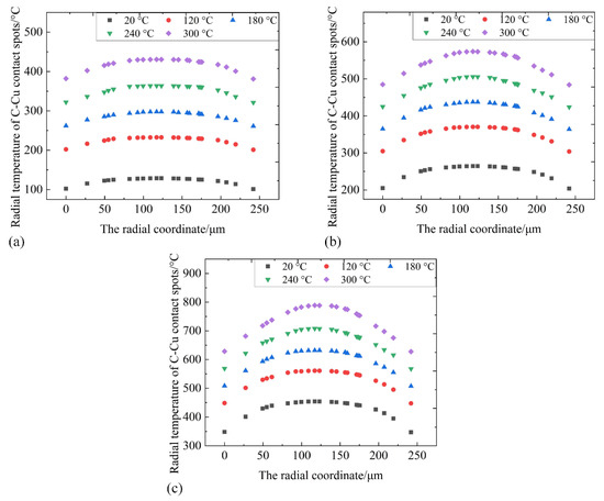Figure 10 shows the radial temperature distribution on the surface of the contact spots in the current range of 40–80 A. The estimated diameter of a single contact spot is about 242 μm. At the same interface temperature, the greater the current, the greater the radial temperature gradient on the contact spots. At 40 A, when the interface temperature reaches 240 °C, only the temperature at the center of contact spots reaches the softening temperature, and the change in the contraction resistance is weak. However, when the interface temperature reaches 300 °C, the whole surface of the contact spots reaches the softening temperature. The deformation increases the surface area of the contact spots and decreases the contraction resistance. Therefore, in Figure 3a, 240 °C is the turning point of the various trends for the AECR at 40 A. When the current is higher than 60 A, the surface temperature on the contact spots is higher than the softening temperature of the copper material, except the interface temperature is room temperature. Under the condition of 80 A at 300 °C, the surface temperature of the contact spots is about twice as much as the softening temperature. In the above case, the influence of the reduction in the contraction resistance caused by material softening on ECR comes into play. The increment in velamen resistance with the increase in the interface temperature is small, as shown in Table 3 and Table 4, so the AECR decreases with the increase in the interface temperature within the current range of 60–80 A, as shown in Figure 3a.