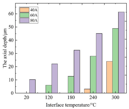 The axial temperature distribution of the contact spots determines the degree of the softening deformation of the contact spots. Figure 11 shows the axial depth at which the contact spot reaches the copper softening temperature at different interface temperatures within the current range of 40–80 A. As can be seen from Figure 11, the axial depth that reaches the softening temperature gradually increases with the increase in the interface temperature, and the maximum depth is up to 61.35 μm. At 60 A, with the increase in interface temperature, the rate of temperature transfer to the axial depth of the contact spots is higher than in the case of 80 A. That is to say, at 60 A, the deformation of the copper spots with interface temperature is more obvious. Therefore, the ECR decreases at a higher rate at 60 A.