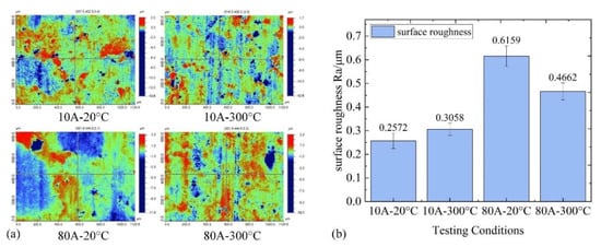 Figure 12 shows the 3D morphologies and surface roughness of the carbon slider at different interface temperatures. It was found that the valleys in 3D morphologies are mainly caused by discharge erosion. Compared with 10 A, the difference between peak and valley at 80 A is more significant, indicating that the intensified discharge leads to a rougher contact surface. By observing surface roughness, Ra, it was found that, with the rise in interface temperature, there are two opposite trends under the currents of 10 A and 80 A. The surface roughness, Ra, increases from 0.2572 μm to 0.3058 μm with the rise in interface temperature at 10 A, increasing by 18.9%, and it decreased from 0.6159 μm to 0.4662 μm, decreasing by 24.4% at 80 A. According to the 3D morphologies, with the rise in interface temperature at 10 A, the area of the individual valley decreases, but the number of valleys increased significantly. The total area of the valleys in the observed area does not change significantly, indicating that the increase in roughness is mainly caused by the increase in the number of discharge erosion pits. In the sliding electrical contact process, higher roughness corresponds to less actual contact area, so the increase in roughness at 10 A is another reason for the increase in the ECR. At 80 A, the total area of the valleys decreases obviously with the rise in the interface temperature, and the surface roughness decreases accordingly, which leads to a lower ECR at 80 A and 300 °C.