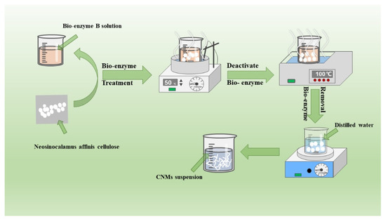Nanocellulose was prepared using a bio-enzyme method [24] with slight modifications, as shown in Figure 2. Take the above cellulose (0.5 g) extracted from different particle sizes into a beaker and add 20 g of zirconia grinding beads (0.1 mm diameter). Configure and fix the volume of 5% cellulase solution and 5% pectinase solution, and add 15 mL each of cellulase solution and pectinase solution to the beaker. Then place it in a 100 °C water bath for 20 min and sonicate for 30 min. The purpose of this is to inactivate bio-enzymes. Afterward, the precipitate was collected and diluted with distilled water by centrifugation at 8000 r/min for 10 min to wash away the biological enzyme impurities and repeated five times. Finally, stir (800–1200 r/min) at room temperature for 30 min, sonicate for 30 min and repeat several times until the suspension is formed. The suspension was freeze-dried into a powder to obtain Neosinocalamus affinis nanocellulose (CNMs).