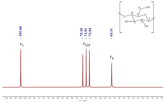 The cellulose was further analyzed in combination with 13C-NMR because of its more complex structure. Based on the above series of characterization, the best Neosinocalamus affinis cellulose (150 μm particle size) was selected and characterized by 13C-NMR. Figure 6 shows the 13C-NMR spectra of 150 μm Neosinocalamus affinis cellulose. The peak at 63.11 ppm is caused by the C6 glucopyranose repeat unit in cellulose. Peaks around 72.54, 73.91 and 75.35 ppm are caused by C2, C3 and C5. The peak at 84.4 ppm is caused by C4 in the non-crystalline region of cellulose. No significant characteristic peak appears at 84.44 ppm in Figure 6. It indicates that the 150 μm Neosinocalamus affinis cellulose was preferentially degraded in the non-crystalline region after the treatment. The resulting increase in crystallinity of the cellulose is in general agreement with the XRD characterization results. The absorption peak at 101.66 ppm belongs to C1 of glucose in cellulose [44].