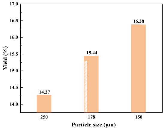 To study in-depth the preparation of nanocellulose using bio-enzymes, the extracted cellulose was prepared into nanocellulose by bio-enzyme B. Figure 7 shows the preparation of CNMs from cellulose extracted from different particle sizes by bio-enzyme B. The yield of CNMs was calculated by Equation (3). The figure shows that the yield of CNMs was 14.27% for 250 μm, 15.44% for 178 μm and 16.38% for 150 μm, respectively. It was clearly shown that the yield of CNMs gradually increased as the particle size of Neosinocalamus affinis cellulose decreased and the contact area of the reaction became larger. Owing to the small particle size, the reaction contact area is large. By the synergistic action of pectinase and cellulase, the endonuclease in cellulase effectively promotes the breakage of molecular chains in the amorphous region of cellulose [45].