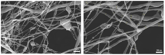 Figure 10 shows the electron micrographs of CNFs prepared from Neosinocalamus affinis powder with a particle size of 150 μm. CNFs in Figure 10 show irregular fibrous bundles. It is because the hemicellulose outside the microfiber inhibits the cleavage and cleavage of the microfiber by cellulase [50]. The average diameter of the CNFs measured and calculated by Image J software was 74 nm. The microstructure of the prepared CNFs can be seen in Figure 10 as a network structure. The nanofibers entangle the fibers in the network structure. It is caused by the interaction between the hydroxyl groups [51]. This network formation capability is an important feature of nanocellulose. This structure greatly increases the regional interface for bonding with the composite and plays a toughening role in the composite [52]. The analysis showed that the prepared CNFs were in the nanoscale range. They can be added to the composites as a toughening component to improve the properties of the composites.