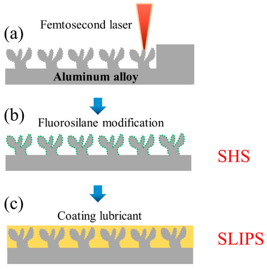 The samples were hydrophilic after femtosecond laser processing. In order to reduce its surface energy, it must be chemically modified by a low surface energy reagent. In our work, the laser prepared sample was immersed in 1% 1H,1H,2H,2H-perfluorooctyltriethoxysilane ethanol solution for 2 h at room temperature and then dried with warm air. The SLIPS was fabricated by dropping Perfluoropolyether (GPL105, Krytox, Wilmington, DE, USA) over the SHS, and then tilted at an angle of about 20° for more than 2 h to remove the excess lubricant from the sample surface. The schematic diagram of the femtosecond laser preparation process of water-repellent coatings in shown in Figure 1.