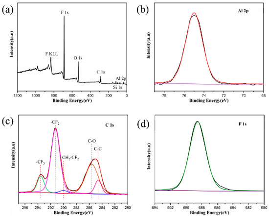 XPS spectra of the SHS: (a) XPS survey spectra; (b) high resolution of Al 2p; (c) high resolution of C 1s; (d) high resolution of F 1s.