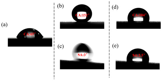 Wettability of the aluminum alloy: (a) CA of Untreated sample; (b,c) CA and SA of SHS sample, respectively; (d) CA and (e) SA of SLIPS sample, respectively.