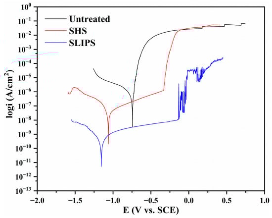 Figure 5 shows the polarization curves of the Untreated sample, SHS and SLIPS, which were immersed in the simulated seawater for 1 h. Table 1 shows the characteristic parameters obtained from polarization curves (Figure 5). The corrosion potential of Untreated sample, SHS and SLIPS are −0.744, −1.06, −1.16 V, respectively. The corrosion current density of Untreated sample is 1.084 × 10−6 A/cm2. After femtosecond laser processing and chemical modification, the corrosion current density of SHS decreases to 1.06 × 10−7 A/cm2. The reduction (90.22%) of current density is close to the surface air–liquid contact ratio (91.77%), indicating that the air layer of SHS reduces the corrosion rate and protects the aluminum alloy from corrosion. After coating lubricant, the corrosion current density of SLIPS further decreases to 1.44 × 10−9 A/cm2, which is ca.3 and ca.2 orders of magnitude lower than that of Untreated sample and SHS, respectively. This means that the insulating lubricant almost completely isolates the corrosive solution from the metal substrate. As the potential gradually increases, pitting starts at −0.332 V for the SHS, after which the corrosion current rises rapidly and converges to that of the Untreated sample. The pitting potential of the SLIPS is lower than that of the SHS at −0.134 V, implying a better resistance to pitting. The sharp fluctuation of the polarization curve after the onset of pitting is due to the spontaneous filling of the pitting by the nearby lubricant preventing further expansion of pitting. These results indicate that the SHS and SLIPS both have good performance in preventing aluminum alloy from the simulated seawater in a short time.