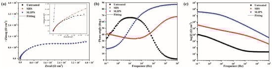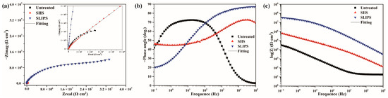 EIS after immersion in simulated seawater for 1 h: (a) Nyquist plots; Bode plots of (b) phase angle vs. Frequency; and (c) vs. Frequency for the three samples.