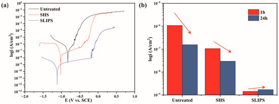 (a) Polarization curves after immersion in simulated seawater for 24 h; (b) Contrast for corrosion current density.