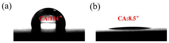 (a) Water CA () on the smooth superhydrophobic surface; (b) CA of lubricant ( ) on smooth surface modified fluorosilane.