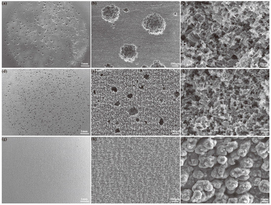 Figure 11 shows the SEM images of the Untreated sample, SHS and SLIPS after electrochemical measurement immersion in simulated seawater for 24 h. Before the SEM test, all samples were ultrasonically cleaned with acetone solution for 5 min to remove corrosion products. As shown in Figure 11a–c, the Untreated sample was covered with hundreds of micrometers of corrosion pits in the circular test area. As shown in Figure 11d–f, the SHS was covered with a smaller scale of about tens of micrometers, but more corrosion pits in the circular test area. The result demonstrated that the SHS effectively improves surface corrosion resistance. As shown in Figure 11g–i, there is almost no corrosion pit on the SLIPS even on the scale of tens of microns. Furthermore, it can be seen from Figure 11i that the lubricant remains attached to the micro/nano structures after the ultrasonic acetone cleaning, which indicates that the rich nanostructures prepared by the femtosecond laser processing greatly improve the adhesion to lubricant and avoid the problems of poor adhesion and fragile paint film of traditional coatings. Meanwhile, the result exhibited that the SLIPS almost completely prevents the occurrence of corrosion. Both water-repellent coatings exhibit excellent corrosion resistance in corrosive solution, and the SLIPS is more effective in preventing chloride ions from invading the substrate.