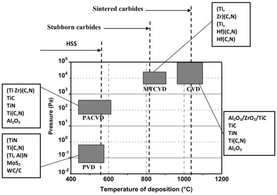 Comparison of materials deposited using different methods, i.e., Physical Vapor Deposition (PVD), Chemical Vapor Deposition (CVD), Plasma Assisted Chemical Vapor Deposition (PACVD), and Medium Temperature Chemical Vapor Deposition (MTCVD) Reprinted from Ref. [7].