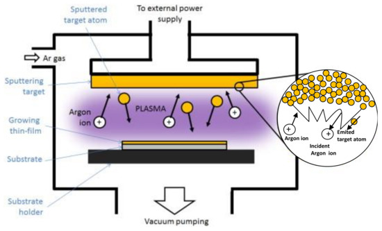 The sputtering phenomenon was first observed in the 1850s and then developed around the 1940s when diode sputtering was first used as a commercial coating process [8]. Sputtering is one of the ultra-high vacuums (UHV) PVD processes used for depositing coatings on substrates. The atoms of a solid target are ejected due to the momentum transfer from an atomic-sized energetic bombarding particle impinging on the target surface [8]. The potential difference in the deposition chamber leads to ionization, acceleration, and orientation of argon ions (plasma) to the target. These plasma ions can dislodge the target atoms or molecules, either through direct collision or initiation of a ‘collision cascade’ resulting in the emission of atoms which then condense on a substrate (anode) as a thin film, as illustrated in Figure 2 [8,14]. The sputtering yield depends on the composition of the target material, binding energy of deposited elements, the incident ions, and the deposition parameters, such as pressure, gases, and applied power.