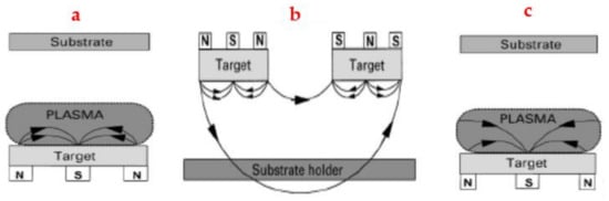 Schematic view of: (a) conventional magnetron sputtering, (b) dual (co-planar) unbalanced magnetron sputtering, and (c) unbalanced magnetron sputtering systems Reprinted from Ref. [21].