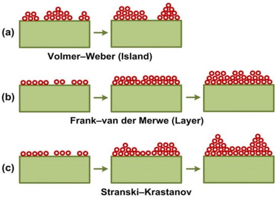 - Volmer-Weber mode (3D-island growth): Small clusters of atoms directly nucleate on the substrate and then grow in three dimensions in the form of islands. This happens when the deposited atoms are more strongly bonded to each other than to the substrate (Figure 5a). For example, the Ni films deposited an ultra-high vacuum e-beam evaporation system can grow with the Volmer-Weber mode with more residual stress [27].