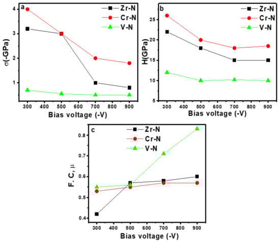 Variation of: (a) residual stress (σ), (b) hardness (H), and (c) friction coefficient (μ) as a function of bias voltage of ternary chromium nitride films Reprinted from Refs. [12,48,49].