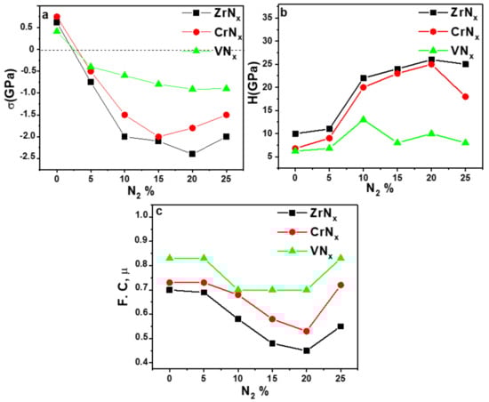 The changes in metallurgical phases have a clear impact on their mechanical properties and tribological performance. Figure 8a shows the residual stresses engendered in CrNx, VNx, and ZrNx coatings during sputtering processes under different percentages of nitrogen. At 0 % N2, the coatings exhibit tensile residual stress in a magnitude of 0.75 GPa (Cr), 0.41 GPa (V), and 0.62 GPa (Zr). The tensile stresses are attributed to the loose structure of the pure chromium, vanadium, and zirconium coatings [39]. The tensile stresses transformed into compressive residual stress for the nitrogen percentage in argon range between 5 and 20% N2. A gradual increase in compressive residual stress was observed up to −2GPa (CrNx), −0.91 GPa (VNx), and −2.4 GPa (ZrNx) as the structure became denser [12,40]. Then, the residual stress of the coatings slightly decreased to −1.5 GPa (CrNx), −0.9GPa (VNx), and −2GPa (ZrNx) with increasing nitrogen from 20 to 25%. This is associated with a significant reduction in the concentration of deposited pure Cr, V, and Zr elements in the coatings. The hardness values of the Cr, V, and Zr coatings, grown without injecting N2, are in the range of 6.8–10 GPa(Figure 8 b) [29]. The coatings deposited at 5% N2 having Cr + Cr2N phases (V + V2N; Zr +Zr2N) exhibited a slightly higher hardness (Figure 8b). The variation in hardness with an increase in nitrogen could be attributed to structural growth. According to the Hall–Petch relationship [12,36], the low hardness was related to the large grain size. Also, the existence of metallic Cr, V, and Zr elements in excess that possess low hardness may be another reasonable explanation for the low hardness [36]. It seems that maximal hardness values were achieved when hard phases of CrN, VN, and ZrN films were generated at 20 %N2, which can be attributed to the high residual stresses, grain refinement, and compactness of films [37].
