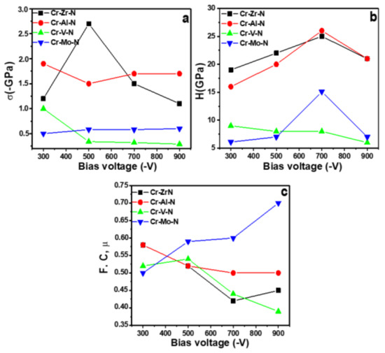 Concerning gas pressure, considerable studies in the literature demonstrated its significant effect on the structural, morphological, physical, mechanical, and tribological proprieties of ternary transition nitride thin films. Various sputtering deposition pressures were tested and correlated with the microstructure of the as-deposited coating. It has been found that lower sputtering pressures led to the appearance of transition metal oxygen-rich (Me-Me-Nx-Oy phases) films, while high sputtering pressures enhanced the formation of stable nitride films [12,47]. Figure 10 presents the effect of bias voltage on residual stress, hardness, and friction coefficient of ternary chromium nitride coatings. The stress analysis of the Cr-X-N (X = Zr, Al, V, and Mo) coatings deposited on XC100 steel and silicon (Si) as a function of X contents by varying the bias voltage is presented in Figure 10a [12,47]. There is no obvious trend between the coatings and the stress level. We note that the Si (100) substrate is very weakly constrained before deposition and presents compressive stress close to −0.02 GPa [49]. The compressive stress of CrN is about −1.98 GPa at −900 V [12,48]. By adding different X transition elements in the Cr-N system, the residual stress engendered during the deposition process increases and leads to different trends. The highest stress was found in the Cr-Zr-N with Cr:Zr ratio = 0.40:0.260 (−2.7 GPa) at −500 V [14], and the lowest stress was obtained in the Cr-V-N with Cr:V ratio = 0.25:0.26 (−0.29 GPa) at −900 V [48]. It is conceived that the residual stress depends on the nature of dopants, such as their size, molecular weight, electro-negativity, charge density, projectile velocity, and momentum in the plasma. These results can be explained by the size of the X atoms incorporated in the Cr-N films. In fact, the X atoms (Zr and Mo) have a larger size and higher atomic mass than those of Cr or N; consequently, their incorporation into the matrix contributes to the modification of the geometry and lattice parameter, which can lead to a volume distortion of the film.