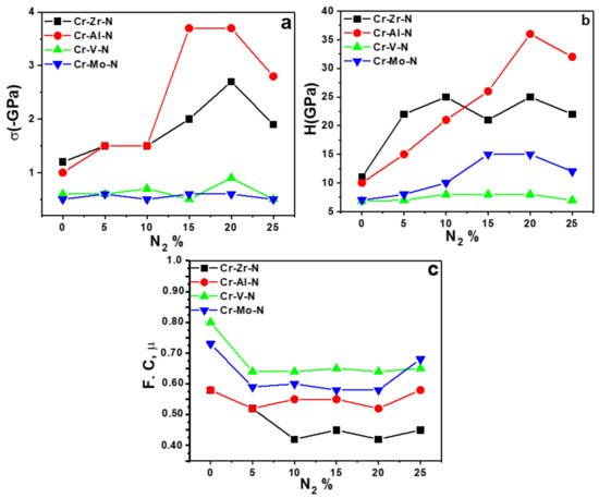 Figure 11 shows the variation in residual stress, hardness, and friction coefficient of Cr-X-N coatings (X = Zr, Al, V, and Mo) deposited at −900 V (Cr), −700 V (X = Zr, Al, V, and Mo) as a function of nitrogen percentage in the deposition gas atmosphere. Without nitrogen, all Cr-X pure metallic films presented low compressive stresses, as shown in Figure 11a. Generally, the residual stress increased for Al and Zr and remained in similar range for V and Mo with increasing amounts of nitrogen. The residual stresses in Cr-X-N films increased with increasing nitrogen percentage, reaching maximum values of −2.7 GPa (Cr-Zr-N), −3.7 GPa (Cr-Al-N), −0.9 GPa (Cr-V-N), and −0.6 GPa (Cr-Mo-N) at 20 %N2 and then slightly decreased at 25%N2 (Figure 11a). Among the Cr-X-N coatings, the results indicate that the residual stress in Cr-Mo-N coating is lower than that measured in the other coatings.