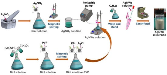 The preparation process of nanosilver wire is shown in Figure 1. The diol solution is obtained by mixing propylene glycol (Macklin, Shanghai, China) and ethylene glycol (Macklin, Shanghai, China) in a ratio of 2:1. A solution: Weigh 6.7 g PVP into the diol solution, stir magnetically until all PVP in the solution is dissolved and the solution turns pale yellow. Then, add 0.075 g KBr (variable 1, 0.1 g, 0.125 g, (Macklin, Shanghai, China)) and 0.255 g AgCl (Macklin, Shanghai, China), and stir magnetically for 90 min at 160 °C (variable 2, 110 °C, 130 °C, 150 °C). B solution: Put 3.4 g of ground AgNO3 (Aladdin, Shanghai, China) powder into the diol solution and stir at room temperature until all AgNO3 is dissolved. B Solution was added dropwise to A solution with a constant flow pump at a flow rate of 5.56 mL/min (variable 3, direct pour, 10 mL/min, 7.14 mL/min), and the reaction was continued with magnetic stirring for a period to obtain the AgNWs solution. The AgNWs solution was cooled to room temperature, and then 15 mL of acetone was added and left to stand for 4 h. The AgNWs solution was then centrifuged with the centrifuge speed set to 2000 r/min and a centrifugation time of 10 min. Finally, the silver nanowires that precipitated at the bottom of the centrifuge tube were dispersed in a solution (deionized water or ethanol) and stored. When studying the effect of one of the variables on the product, the remaining variables are kept constant and at their initial values.