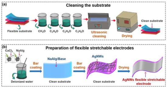 First, cut the substrate film (PDMS (Macklin, Shanghai, China), cellulose paper (Macklin, Shanghai, China), nonwoven fabric (Macklin, Shanghai, China)) into small pieces of the same size, cleaned with methanol, acetone, ethanol, and deionized water ultrasonically four times, and then dried at 70 °C for use (Figure 2a). Prepare sodium alginate (NaAlg) solution: Weigh 1 g sodium alginate (Macklin, Shanghai, China) and 0.1 g calcium chloride (CaCl2, (Macklin, Shanghai, China)), respectively, dissolve calcium chloride in 30 mL deionized water, and then add sodium alginate. Quickly stir at room temperature until the solution is viscous, and then leave it under seal for 12 h for deaeration. Preparation of flexible stretchable electrodes: The NaAlg solution is applied to the substrate (PDMS, paper, nonwoven fabric) by a bar coating method. Then, the AgNWs dispersion is evenly coated on the substrate material and finally dry at 60 °C (Figure 2b). The preparation method of AgNWs dispersion is the same as that in Section 2.1 (experimental variables are all initial values).
